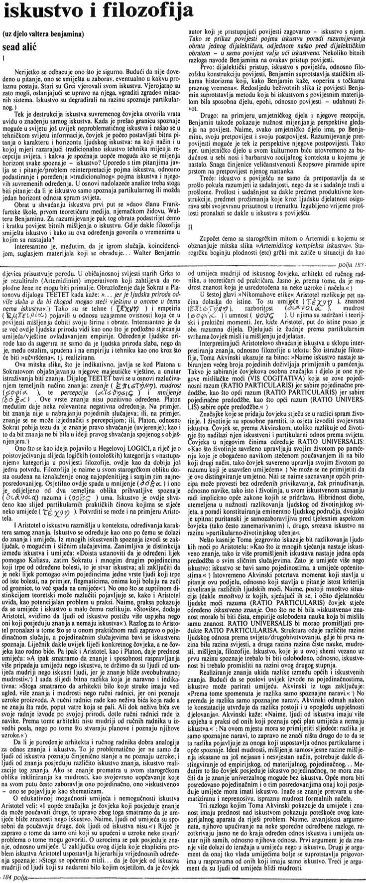 Sead Alić: Iskustvo i filozofija Posted by seadalic | Feb 24, 2015 | Tekstovi u časopisima | 0 | Naslovnica download: pdf Iskustvo i filozofija (Časopis “Polja”, broj 338-339, Novi Sad mjesečnik za kulturu i umjetnost, 1987., str. 183-187)