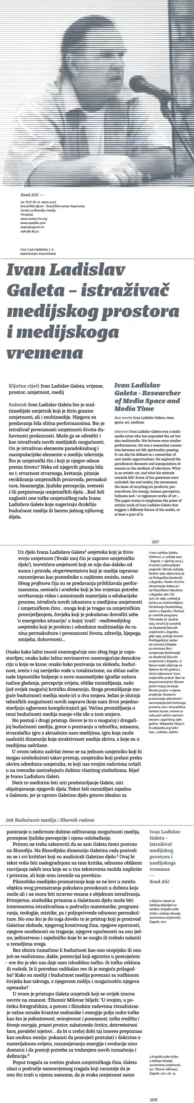 Ivan Ladislav Galeta – istraživač medijskog prostora i medijskoga vremena (Budućnost medija, Zagreb, Sveučilište Sjever i CFM, 2015., str. 306-319, Prethodno priopćenje UDK 7:316.774Galeta, I. L.)